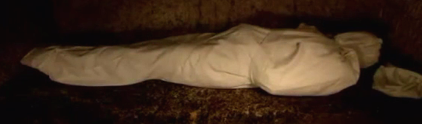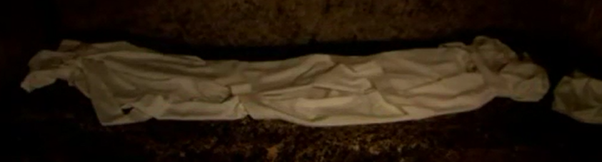 Why was the Shroud torn? This may have had to do with the Jewish custom of tearing their clothes, as a sign of mourning? And also perhaps as sign of a life being torn in death? Therefore, Jesus’ body may have appeared in the tomb as pictured below: wrapped in the main body of the Shroud, and tied with the strip linen which was torn from the shroud.